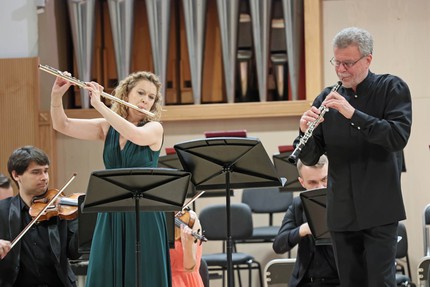 В данном случае второй солисткой стала Мария Чепурина. О невероятной партнерской чуткости обоих музыкантов, их понимании с полувзгляда и полузвука и говорить не приходится. Они издавали столь чудесные виртуознейшие рулады, будто в этом галантном, идеальном, пасторальном мире встретились два пастушка и элегантно, трепетно воркуют. У оркестра была иная «действующая роль»: в первой части он вносил драматическую ноту, бурлил, оспаривал благополучие дуэта; во второй, медленной части – был в гармоничном слиянии с солистами и в полном умиротворении; в финале – восхищался протагонистами, поддерживал их и празднично ликовал.