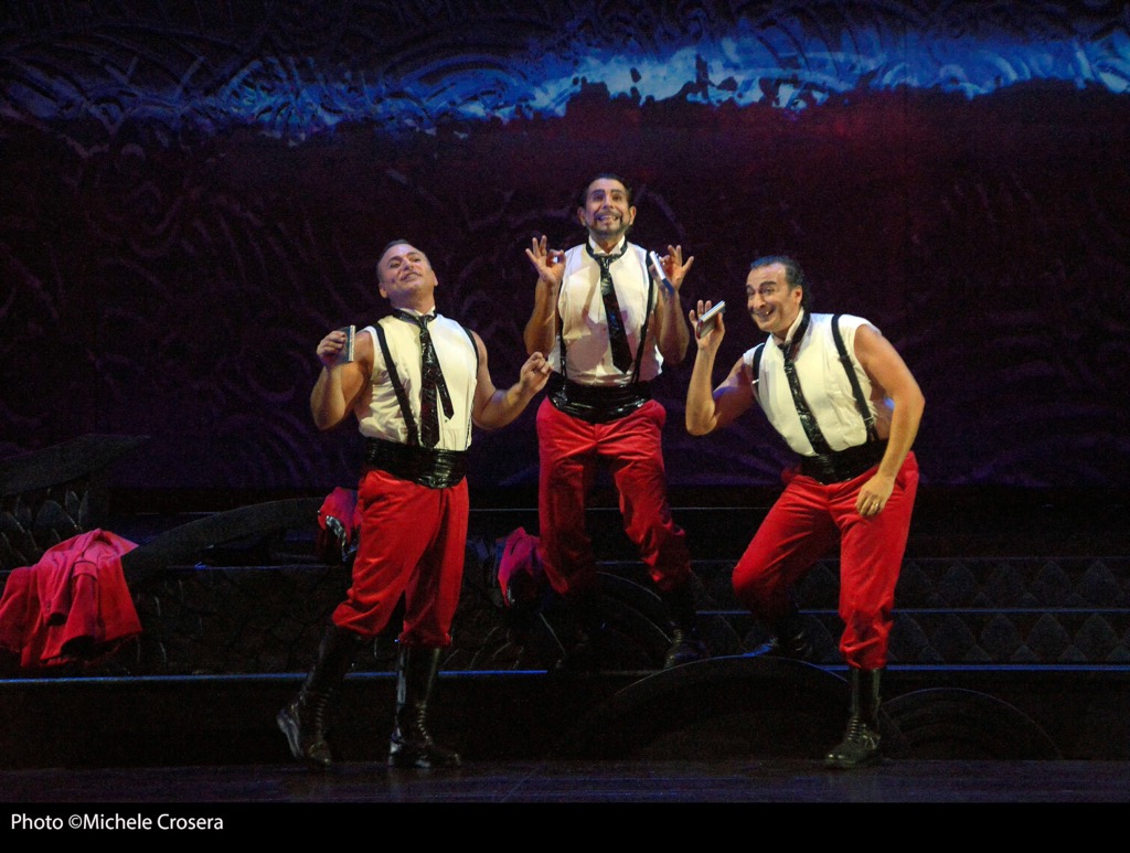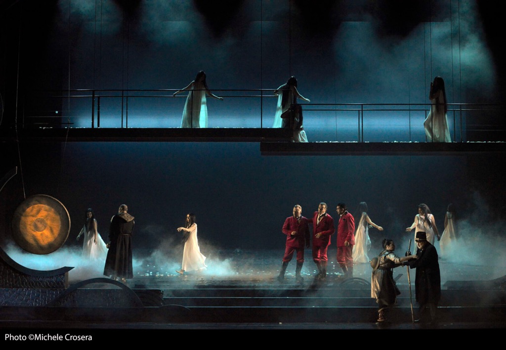 Сценография была создана Алессией Колоссо с помощью двух кривых подвесных люлек, подиума в форме мавзолея и чёрного задника, а костюмы Симоне Вальсекки неуловимо намекают на китайские мотивы в летних коллекциях Zara c ярко-красными всполохами кровавых акцентов, чтобы уж совсем не отклоняться от сюжета. В немногочисленных рецензиях на это яркое событие провинциального значения можно прочитать о бурных нескончаемых овациях и грандиозном успехе. Не будем это комментировать, чтобы лишний раз никого не обижать: после моей прошлогодней рецензии на местную «Сельскую честь» и так душа не на месте.