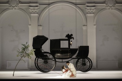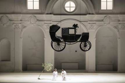 29) Карета. Карета, как нетрудно догадаться, напоминает о бесконечных путешествиях семьи Моцартов, которые были своеобразным видом роуд-шоу, необходимыми для продажи учебника игры на скрипке Леопольда Моцарта. Но поскольку карета опускается с колосников в сцене соблазнения Дон Жуаном Церлины, можно вспомнить, что карета являлась символом благополучия и успеха точно так же, как сегодня таким признаком является хороший автомобиль. Неудивительно, что, когда появившаяся Дона Эльвира прерывает процесс соблазнения, у кареты отваливается колесо. Здесь же всплывает эпизод триумфального приезда Моцарта с женой и первенцем в Зальцбург в 1783 на частном экипаже из Вены, что стоило по тем временам целое состояние и свидетельствовало об успехе и благополучии музыканта.