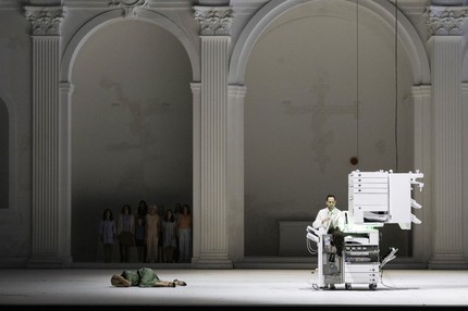 16) Многоликий Дон Оттавио. Образ Дона Оттавио в спектакле Р. Кастеллуччи – настоящий кладезь намёков, эпитетов и поговорок. Например, модель военного корабля, которую этот герой выносит на сцену, вызывает в памяти шутку о том, что самый идеальный муж (для Донны Анны) – это слепоглухонемой капитан дальнего плавания (Дон Оттавио в этой сцене не случайно в адмиральском белом кителе). Череп, который появляется на белых радиаторах, напоминает о шекспировском Гамлете, который на кладбище находит череп своего «аниматора» Йорика. Эта сложная метафора иллюстрирует и сомнения Дона Оттавио в способности благородного Дон Жуана убить Командора. Также эта деталь может служить намёком на так называемый «череп Моцарта», который хранится в зальцбургском фонде «Моцартеум» и анализ ДНК которого проводился в 2006 с целью установления его подлинности (результаты оказались неутешительными).