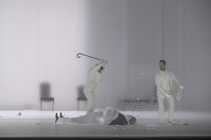 23) Мусорная вакханалия. Финал I акта, в котором в результате симуляции недееспособности Дон Жуану удаётся избежать наказания за нападение на Церлину, создаёт определённую сложность для традиционной интерпретации: ну кто поверит в то, что человек изобразил сердечный приступ и тут же от него все отстали, правда? В версии Р. Кастеллуччи эта сцена представляет собой «мусорную вакханалию», в которой происходит множество хаотичных движений, представляющих собой тщательно выстроенное театральное действие. Напомню, что эту сцену предваряет знаменитый трюк с полиритмией, когда одновременно звучат три мелодии — контрданс, лендлер и менуэт. Сегодня этот приём повсеместно используется диджеями в ночных клубах, миксующих музыку в трёх разных темпах. Именно этот ритмический хаос материализуется в «мусорном апофеозе» первой части спектакля.