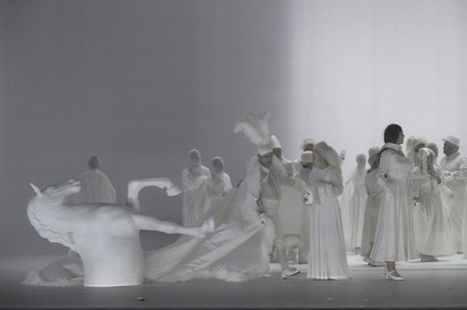 19) Тюль. Текстильный компонент в творчестве Р. Кастеллуччи встречается часто. В спектакле про Дон Жуана, зависимого от женщин, как от воздуха, тюль, развешенный по периметру сцены, приводится в волнообразное движение артистками миманса. Эти текстильные волны символизируют волнения в душе мужчины при ожидании контакта с женщиной.