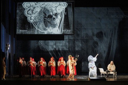 Здесь К. Гут полностью игнорирует очевидные различия между разными историческими контекстами, и это производит впечатление режиссёрской неопрятности. При том, что в довольно скудных сценографических элементах (оформители спектакля – Кристиан Шмидт и Урсула Кудма (костюмы)) прослеживаются заимствования из «Евгения Онегина» Дм. Чернякова, хотя общий чёрный фон выглядит скорее капитуляцией создателей спектакля перед материалом