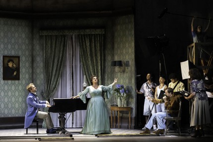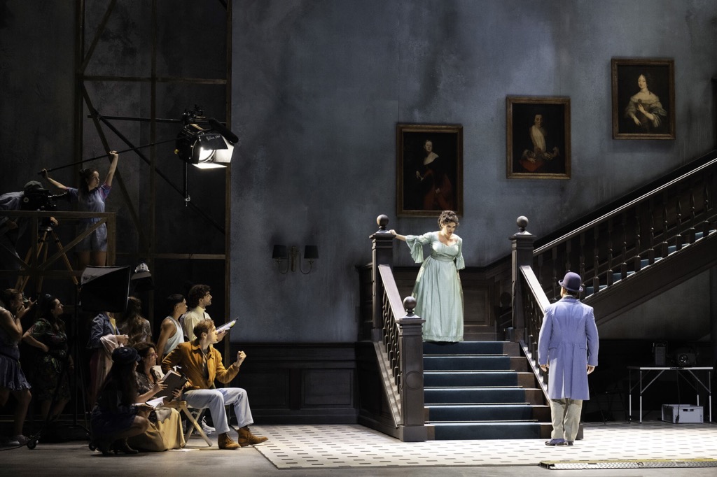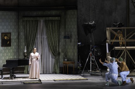 Если вы в 2024 году в спектакле про кино во всю сцену городите гигантскую серо-бетонную стену, похожую на экран, то не логично ли на ней хоть что-то показать, кроме одного анфасного лика главной героини? Нереализованных возможностей и без того вымученной драматургии в спектакле предостаточно. Например, когда у вас миманс и хор смотрят с интересом телевизор, повёрнутый к зрительному залу задней стенкой, то на огромную пустую стену логично было бы спроецировать содержание телепередачи, на которую бурно реагируют 90% участников спектакля? Иначе получается, что артисты там сами с собой развлекаются, а зрителей, которые всё это шоу оплатили (хоть билетами, хоть налогами: Зальцбургский фестиваль — это всё-таки госпредприятие), забыли пригласить что ли?