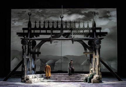 На итальянской стороне обсуждаемого проекта «Астана Оперы» оказался режиссер-постановщик Джанкарло дель Монако, сын культового тенора XX века Марио дель Монако (1915–1982), а тандем сценографа и художника по костюмам составили Эцио Фриджерио и Франка Скуарчапино. Художником по свету выступил Виничио Кели, а весьма важную роль художника видеопроекционной графики, создавшей живописную романтику Великой степи – родной среды обитания казахских племен и родовых общин, – взял на себя Серджо Металли. В невероятно помпезной, зрелищно богатой в аспекте сценографии и костюмов постановке аллегория Великой степи как праматери всего сущего – на первом плане.