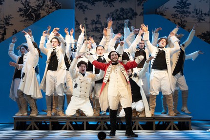 — Да. Евгений Писарев — талантливый режиссёр, с развитым вкусом, своей сформированной годами эстетикой. Вы очень верно отметили про баланс между жанрами. Евгений добивался от нас именно этого — чтоб мы чувствовали тонкую грань между пикантным юмором и пошлостью. Он хотел сделать комический спектакль с лёгким французским флёром, потому что музыка требует именно этого, и наш дирижёр, маэстро Клеман Нонсьё неустанно за этим следит, посылает нам из оркестровой ямы свои энергетические импульсы. Артисты находились в хорошем смысле слова в железных рукавицах: давали свой посыл, но не забывали об означенных рамках, знали, что если перегнём палку, случайно зайдём за черту, превратим оперу в кабаре. Путеводных помощников, к счастью, помимо режиссёра и дирижёра, было много. Нас наставляли и драматические артисты, привлечённые к постановке (Сергей Епишев, Олег Савцов), и коуч по французскому Ирина Цыпина, с которой мы очень много занимались произношением, и пианисты-концертмейстеры (Юлия Банькова, Станислав Пылов, Евгений Захаров) всегда были рядом. Партия огромная: три акта, бесчисленное множество дуэтов, ансамблей — всё разучить было непросто, премьера стала настоящим вызовом для меня.