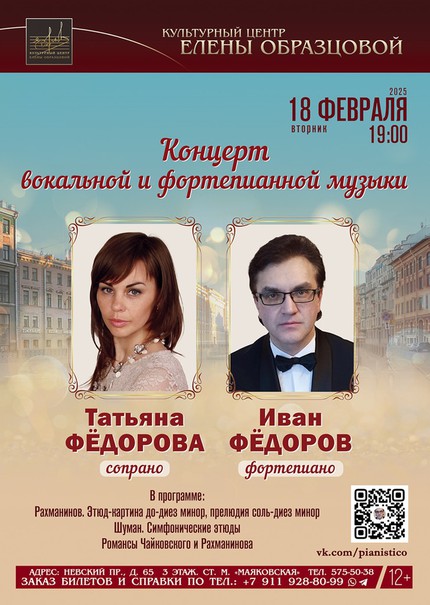 18 февраля (вторник) 2025 года в 19:00 в зале Культурного центра Елены Образцовой в центре Санкт-Петербурга состоится концерт вокальной и фортепианной музыки. Исполнители — лауреаты международных конкурсов Татьяна Фёдорова (сопрано) и Иван Фёдоров (фортепиано).