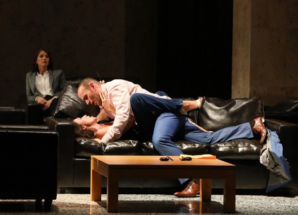 Действие «Кармен» перенесено в реабилитационный центр, в который озабоченная и симпатичная Микаэла (блестящая актёрская и вокальная работа Эльзы Драйсиг) приводит мужа Хозе (роскошная мелодраматическая работа Михаэля Фабиано). Что у Хозе за проблема, мы не знаем, потому что об этом говорится на французском языке. Признаться, я даже не стал напрягаться, чтобы эту прозу расшифровать, так как и без погружения в детали анамнеза понятно, что режиссёр использует привычный для себя приём обытовления истории, деромантизации и оглупления всех без исключения персонажей. Кармен (прекрасная работа Стефани д'Устрак) выглядит дурочкой с переулочка, но оставляет надежду на диалектику развития образа.