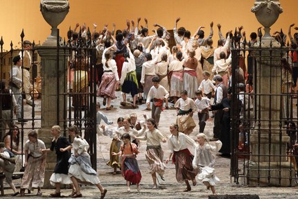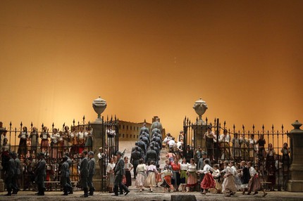 Спектакль Лины Вертмюллер (1992), реконструкция которого идёт сегодня на сцене Баварской оперы, создан в эстетике костюмированной театрализации прошлого века, но радость встречи с чем-то цветным и нарядным длится примерно минут десять. Дальше шаблонная организация мизансцен, когда все, как по команде, вышли, выстроились, спели и ушли, начинает отвлекать от сюжета и музыки.