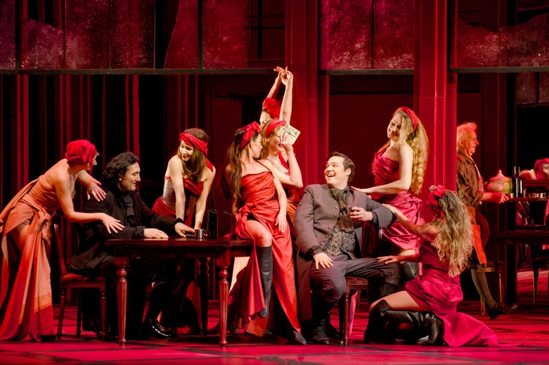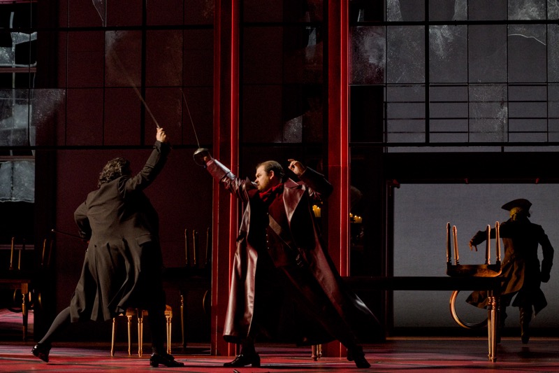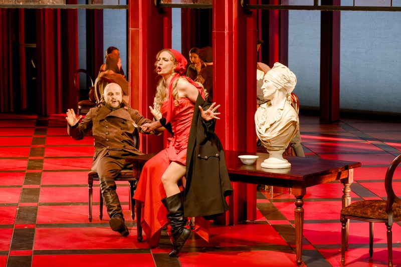 При этом в отсутствие звезд на тройку главных персонажей (а мы ведем речь о первом премьерном показе 7 марта) среди многочисленных персонажей-эпизодов невозможно не выделить две работы – Екатерины Лукаш (Берси) и Ларисы Андреевой (старуха Мадлон, бросающая в жерло революции своего последнего внука после того, как погибли ее сын и старший внук). Вообще, тезис о том, что революция пожирает своих детей, не нов, и в этой опере он звучит так же пронзительно сильно. Берси и Мадлон – два диаметрально противоположных характера меццо-сопрано, но сыграны были они и, главное, спеты при идеальном стилистическом соответствии скромным, но емким музыкальным задачам.