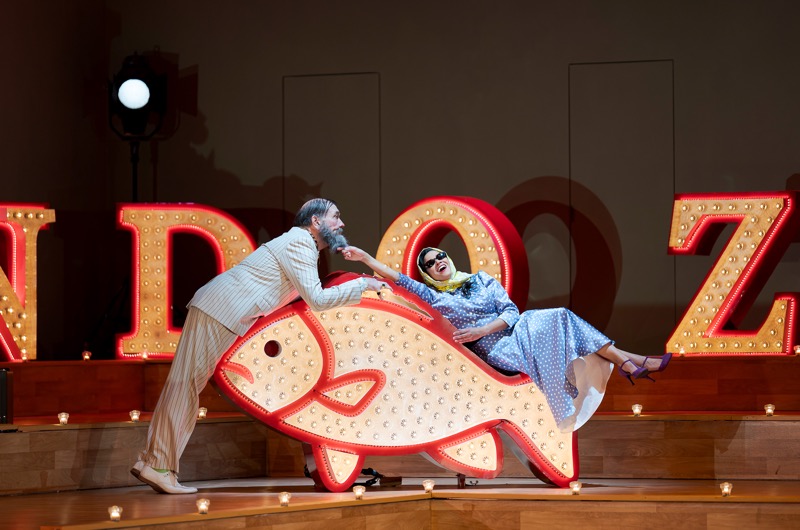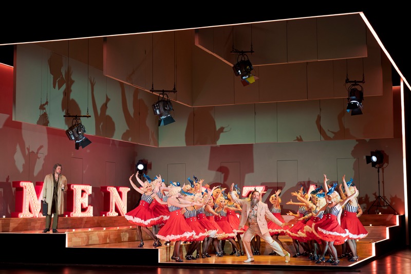 Если же оценивать то, что было предложено режиссёром в рамках его квалификации, то мы увидели прекрасное шоу в стиле Боба Фосса «Милая Чарити» (1969) в актуальных павильонах-трансформерах с неоновой окантовкой Паоло Фантина и пёстрых изобретательных костюмах Клауса Брунса. Надо заметить, что костюмная эклектика К. Брунса играет важную роль в пространственно-временной локализации спектакля, прямо указывая на время первого исполнения произведения Прокофьева — конец 40-х годов прошлого века.