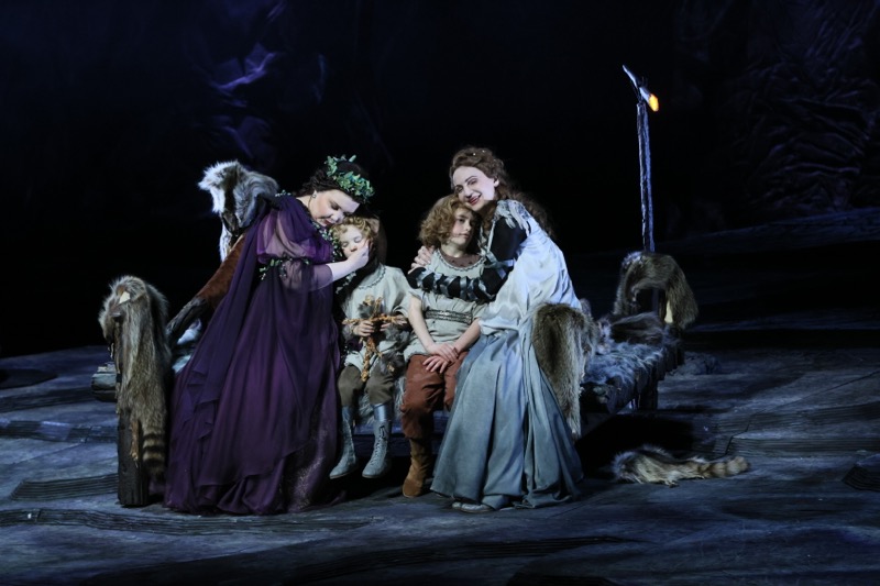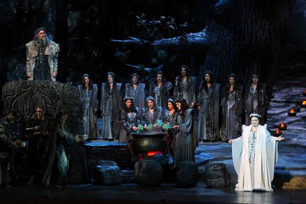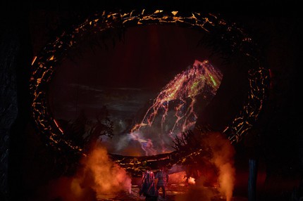 Впрочем, если учесть, что Ирминсуль – это священное дерево, олицетворяющее бога войны Ирмина, то аллегорически священный дуб-великан, проросший побегами омелы и предстающий взору с открытием занавеса, и окружающая его заповедная роща как раз и служат экстерьерным аналогом некоего ритуального храма-святилища. Всё очень условно, и для разворачивающейся драмы сюжетного действия важны не столько детали обрядовости, сколько ее романтический фон. Лесные, древесные и скальные мотивы сценографического оформления очевидны и, несмотря на их мрачную и, как оказывается в финале, зловещую загадочность, визуальный фон спектакля чрезвычайно живописен: искусная сценография, постановка света и видеоэффекты восхитительны!