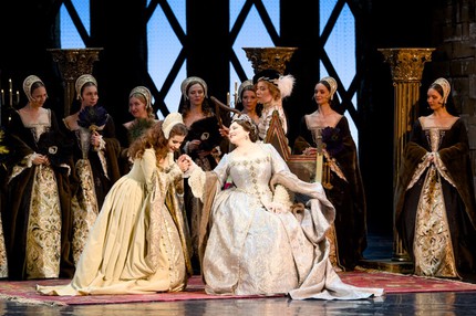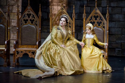 Это намек на ожидающий своего черёда виток истории, когда дочь Генриха VIII и Анны Болейн, при жизни короля лишенная права престолонаследия, действительно взойдет на британский престол. А для знатоков это еще и понятный намек на то, что «Анна Болейн» (1830) – лишь первая часть негласной трилогии о Тюдорах, в которую входят также оперы Доницетти «Мария Стюарт» (1835) и «Роберт Деверó, или Граф Эссекс» (1837). В них Елизавета – сквозная героиня, в одной опере сама уже отправляющая на плаху королеву Шотландии Марию Стюарт, а в другой – своего фаворита Роберта Деверо.