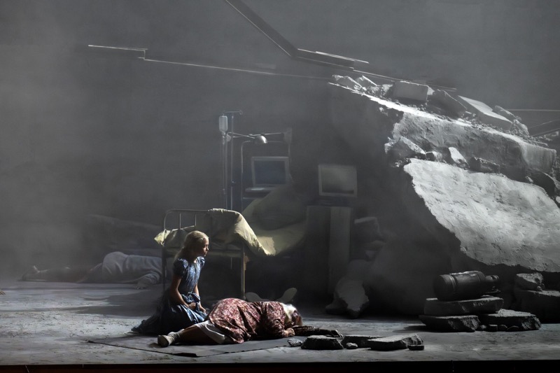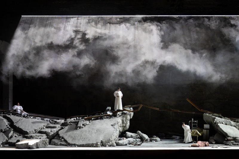 В программе Зальцбургского фестиваля 2025, на котором дебютировали в разных жанрах сразу три российских режиссёра, опера «Три сестры» в постановке Евгения Титова была представлена следом за эсхатологической версией «Юлия Цезаря» Дмитрия Чернякова. Спектакль Титова начинается с того, чем заканчивается спектакль Чернякова: пути назад нет, война изменила всё, и несчастные три сестры не могут вернуться в родную Москву не из-за своей чеховской нерешительности, а потому что взрывом разрушен мост, а город, в котором они оказались волею судьбы из-за военной приписки отца, постоянно охвачен пожаром.