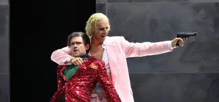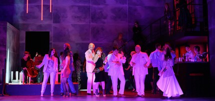 Клубный стиль хрестоматийного приёма полиритмии (об этом подробно в моей лекции) идеально согласуется с выбранным в спектакле А. Лидтке прочтением. Сценография Филиппа Рубнера с вращающейся многоуровневой конструкцией и люминесцентными огнями («Не просто клуб» гласит рекламная надпись на входе в павильон, где разворачивается действие) и костюмные фантазии на тему «лихих 80-х» Йоханны Лакнер формируют базу для главного разоблачения.