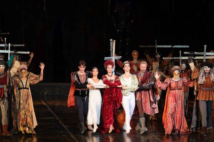 Он вводит в «Ромео и Джульетту» образ Ненависти, представленный шестью танцовщиками, которые имеют власть обращаться с персонажами как с марионетками, именно они вкладывают мечи в руки членов семей Монтекки и Капулетти, именно они внушают Тибальду подозрения относительно Ромео, именно они празднуют триумф, склоняясь над очередной жертвой бессмысленной вражды. Белорусский хореограф превосходно выстраивает массовые сцены и, подобно ювелиру, составляющему комбинации из драгоценных камней, создает дуэты влюбленных — образные, подробные, страстные.