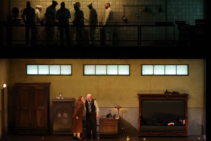 Все сцены оперы предстают в двух регистрах: сначала как проекция допросов процесса дознания, а потом как реальные события, приведшие к преступлениям. Переходы между показаниями участников уголовного дела и ретроспективной реальностью обозначены при помощи изобретательной светоцветовой программы Александра Сиваева. Чёрно-белые фото улик и вещевых доказательств, появляющиеся на чёрном занавесе, словно прорастают в монохромной цветовой гамме освещения соответствующих мизансцен, а потом эти мизансцены расцвечиваются полихромными фильтрами и становятся реальными элементами повествования. За этой сменой регистров «Катерина в наручниках рассказывает» // «Катерина без наручников показывает» нелегко уследить, но само по себе решение понятно и логично.
