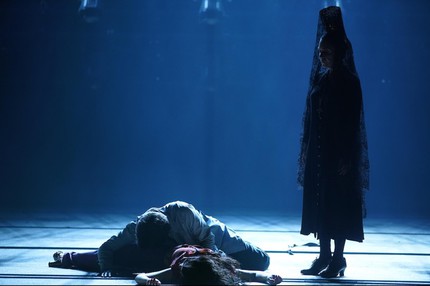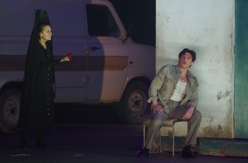 Наиболее убедительным режиссёрским решением становится введение образа матери Хозе — молчаливой, осуждающей фигуры, проходящей через все четыре акта спектакля. Этот персонаж, олицетворяющий традицию, судьбу и смерть, постоянно присутствует на сцене и становится зримым напоминанием о травматическом прошлом главного героя. И если мы вспоминаем ключевые отличия между персонажами новеллы П. Мериме и оперы Ж. Бизе, то понимаем, что это одно из немногих решений, придающих прочтению смысловую глубину.