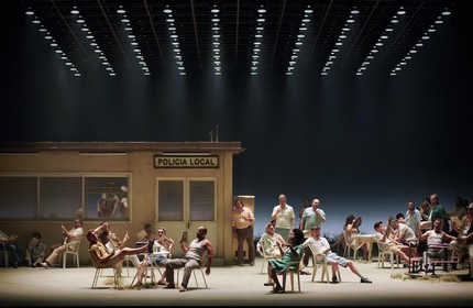Пространственные и временные отсылки, заложенные в либретто, здесь сознательно игнорируются. Севилья исчезает, и действие переносится в среду, напоминающую засушливую сельскую местность, в которой есть полицейский участок и стрип-клуб. Также есть фабрика, сотрудницы которой одеты так, будто работают на овощебазе, где температура всегда +15. Участники прекрасно звучащего хора и артисты миманса обмахиваются всем, чем можно, изображая невыносимую жару, но судя по костюмам, на улице не жарко.