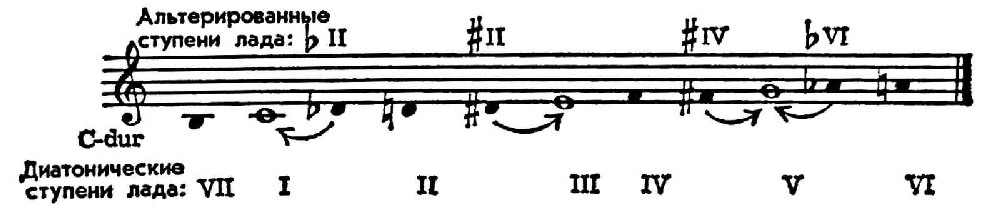 2) В учении о гармонии альтерация обычно понимается как хроматическое видоизменение основных неустойчивых ступеней звукоряда, обостряющее их тяготение к устойчивым (к звукам тонического трезвучия). Напр., в C-dur: