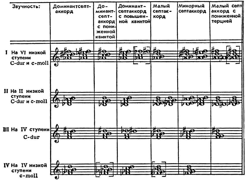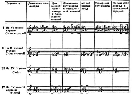 Аккорды, содержащие хроматически видоизменённые звуки, называются альтерированными. Важнейшие из них образуют 3 группы. Основой каждой из них является увеличенная секста, которая располагается полутоном выше одного из звуков тонического трезвучия. Таблица альтерированных аккордов (по И. В. Способину):