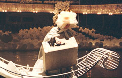 Публика входила не в зал рижской Оперы, а протискивалась сквозь узкую дверь прямиком на сцену. Постановщики спектакля - чешский режиссер Иржи Неквасил и сценограф Сусана Ежкова - с легкостью поменяли местами сцену и зал. Взору сидящих открывалось великолепное и странное зрелище: пышный трехъярусный зал, с ложами, позолотой и сияющим свежими красками старинным куполом, весь был усеян белыми воздушными шарами. Пейзаж получался фантастический: казалось, сотни маленьких привидений расселись в партерных креслах и тихо покачивают головами.