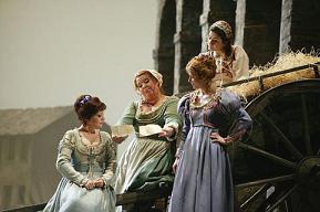 Великий театр «Ла Скала» славится прежде всего совершенством вокальной составляющей своих спектаклей – в течение двух столетий на его сцене выступали лучшие мировые певцы. Но и уровень постановочных решений миланского Дома Верди оказывается ничуть не хуже. Яркое свидетельство тому – спектакль Стрелера. Даже в импортном варианте, возобновлённый уже другим режиссёром (Мариной Бьянки), он производит неизгладимое впечатление, оставляет именно то послевкусие, за которое мы ценим настоящие театральные удачи. Миланский «Фальстаф» - образец вкуса, меры, изящества. Это настоящий большой оперный стиль, но не бьющий наотмашь, не поражающий своей гигантоманией и обилием «реализмов» на сцене, а берущий гармонией всех составляющих. Возможно, нет смысла рецензировать классику – спектакль Стрелера хорошо известен, признан. Трудно сказать, насколько московский вариант аутентичен миланскому первоисточнику в каждой детали. Но одно бесспорно – и российский вариант смотрится столь же безупречным с точки зрения эстетики большого стиля. Сценография Эцио Фриджерио – образец по-античному гармонично выстроенного пространства с его простотой линий и объёмов, с неяркими, пастельными цветовыми сочетаниями. Особенное впечатление производит игра света – непрямолинейная, несколько необычная в оперном театре, где принято концентрировать внимание публики на примадонне или премьере: полутона, светотени, словно сошедшие с полотен эпохи Возрождения как нельзя более уместны в ансамблевой опере, где как раз и не требуется однозначное акцентирование каких-то определённых персонажей в ущерб другим. Мизансцены продуманы до мелочей и в то же время абсолютно естественны, мотивированы всей логикой произведения. Всё это создаёт удивительную иллюзию реальности нереального, когда даже наивная рисованная перспектива во второй картине (площадь в совсем неанглийском Виндзоре) словно дышит сонным зноем Пармы или Феррары. Лучшего подарка российские театралы и представить себе не могли: в эпоху повсеместного разочарования в реалистических традициях увидеть с таким изяществом решённый реалистический спектакль. Каждой своей составляющей спектакль очень чутко развивает мысли композитора – это комическая опера, но отнюдь не буффонада, не гротеск (которым здесь тоже есть место), не буйство красок, а нечто более глубокое - в нём много лирики, ностальгии, лукавой полуулыбки.