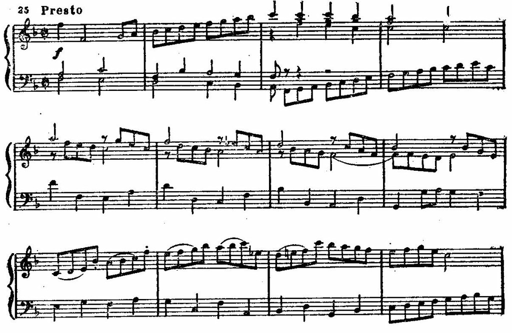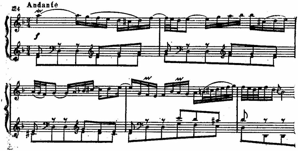 Новым для клавирной литературы являются приемы гомофонного изложения с ясным разграничением выразительных функций каждой руки. Мелодия обособлена от аккомпанемента, ее ведет правая рука в верхнем голосе — нижний и средние голоса исполняет левая рука. Звучание мелодии можно уподобить не только скрипке, но и какому-нибудь деревянному духовому инструменту (флейте или гобою), выразительные линии параллельно движущихся средних голосов — аккомпанементу струнного ансамбля, поддерживаемого мерным, почти неподвижным басом. Самостоятельность трех пластов музыкальной ткани создает ощущение звуковой перспективы и в то же время внутренней напряженности и сдержанной экспрессии.