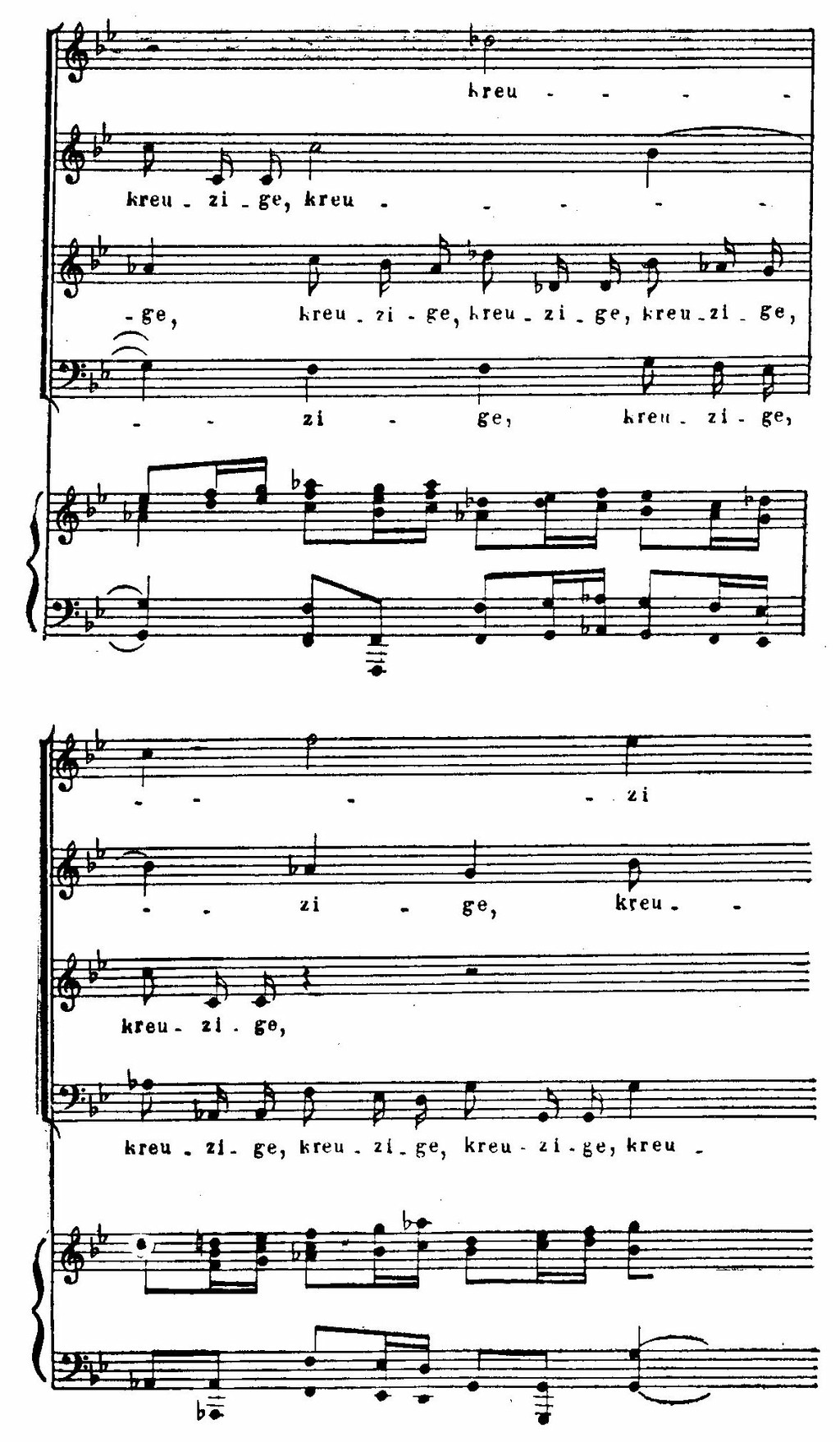 О драматизации хоралов уже говорилось. Самое примечательное в этом смысле — заключающий первую часть Пассиона огромный фигурированный хорал на архаичный текст: «Рыдайте, люди, тяжек грех, но уж грядет спаситель наш». Это настоящая песнь грядущей славы пророку, возникающая в тот момент, когда, покинутый бежавшими учениками, он в стане врагов фанатически убежденно провозглашает свою миссию. Величаво-гимнический напев расцвечен роскошным инструментальным узором; он выносит на поверхность звучания сверкающие гармонии ми мажора (объединяющая тональность первой части) и возрождает ликующие юбиляции средневековья (В некоторых учебниках этот хорал интерпретируется как взрыв народного гнева по поводу иудина предательства. Здесь очевидная путаница с предшествующим хором в си миноре (гроза).).