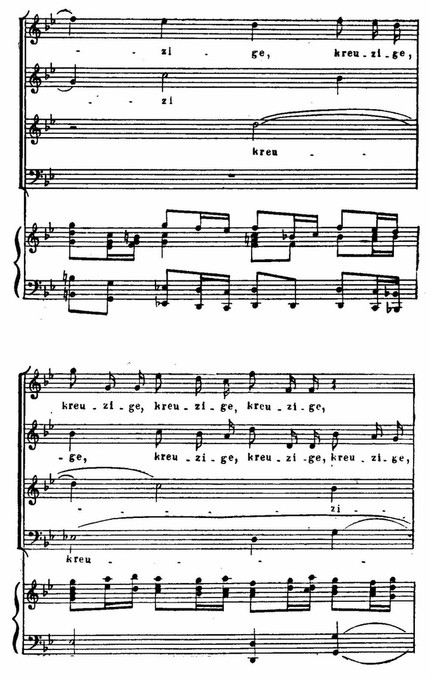 Эпизод Голгофы и крестной смерти героя решен в плане «глубинной», скромно затененной кульминации. Его окружение составляют элегические арии-плачи (Pieta), вызывающе-бравурный хор поругания, знаменитое «Порицание Голгофе» с колокольным аккомпанементом и большой внутренней силы речитатив евангелиста (тенор), в напевно-декламационной манере ведущего горестное повествование. В оркестровой звукописи запечатлена картина землетрясения. Потом наступает спад кульминации: у креста являются женщины, среди них покаявшаяся Магдалина, Иосиф Аримафейский... Чей-то бас (то ли Иосиф, то ли голос из народа) запевает вдохновенную похвалу наступающим сумеркам. Заключительная сцена Пассиона — «положение во гроб» — выдержана в том эмоциональном характере тихой и ясной скорби, какая была и осталась традицией немецкого творчества на эту тему — от Матиаса Грюневальда и до Пауля Хиндемита включительно. Завершающий композицию надгробный хор гомофонного склада — поэтическая элегия или эпитафия в c-moll на весьма непритязательные стихи. Мелодия насыщена вздыхающими интонациями, плавное скольжение параллельных терций и секст, баюкающий ритм сгущают ласковую атмосферу дремотно-светлого покоя. Кроткая и задушевно-общительная, эта песня явно обращена не к «богу-сыну», но к «человеку только — человеку, каких родит природа ежедневно». Именно здесь, к концу огромной религиозной эпопеи, все потустороннее, сверхчеловеческое окончательно преодолено и исчезает бесследно — не только в музыке, но и в последних словах либретто: