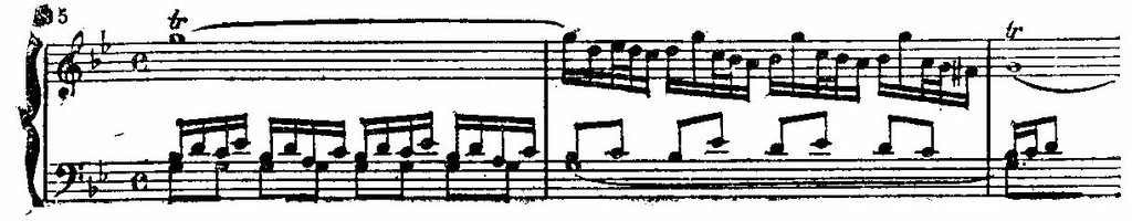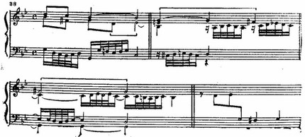 Однако достигнутая вершина и светлый колорит си-бемоль-мажорной тональности господствуют недолго. Вскоре же восходящее движение спадает, а вместе с тем отодвигается и мажор, вновь уступая место минорному ладу. Поворот к минору углубляет контраст срединного мажорного эпизода с окружающими его минорными.