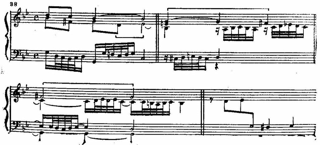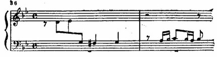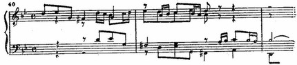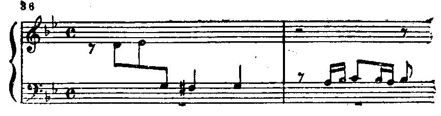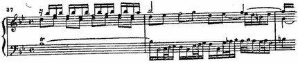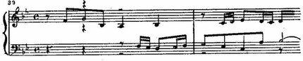 Некоторые приемы выразительности, которыми обрисована тема фуги, типичны у Баха при воплощении раздумчивых лирико-драматических музыкальных образов. Индивидуальность теме придает сочетание напряженных секундовых, полутоновых оборотов с патетическим ходом на уменьшенную септиму к акцентируемому вводному тону (Характер, выразительные свойства баховских тем яснее всего сказываются в их интонационном строении, в строении интервалов. В скорбных минорных темах Бах часто пользуется падающими секундовыми ходами мелодии, которые как бы воспроизводят человеческий вздох, стон: например, тема «Куrie eleison» из си-минорной мессы; хоровая мелодия «Crucifixus» оттуда же, тема фуги си минор из первого тома «Хорошо темперированного клавира» и много других.) (см. пример 36).