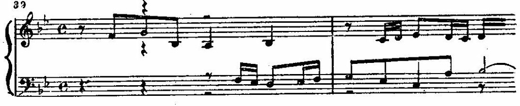 Пасторальность темы подчеркивается своеобразием мелодического рисунка; в переливчатости трелей, в грациозных поворотах мелодии и ритма как бы имитируется звучание свирели и пастушеского наигрыша. Отодвинутые на большое расстояние два органных пункта (два крайних голоса) вызывают ощущение дали, простора. Прозрачность колорита усиливает пасторальные тона темы.
