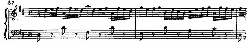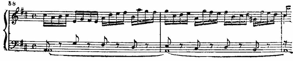 Тема ре-мажорной фуги — своеобразное претворение героической тематики, почерпнутой из оперно-ораториальной музыки того времени. Типичны приемы и средства выразительности: маршевая активность пунктирного ритма, декламационная приподнятость интонаций (затактовый ход на сексту вверх), театрально-торжественный ритмический «убор», тональность ре мажор, чаще всех других используемая в оперных увертюрах, в батальных сценах, в бравурных и героических ариях. Перенесенные в сферу камерной музыки и специфического клавесинного звучания, эти выразительные средства хотя и претерпели глубокие изменения, все же не утратили своей характеристичности.