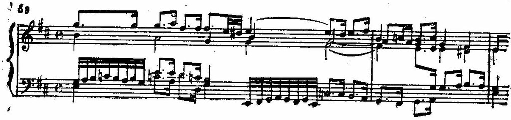Большая звуковая волна заполняет всю среднюю часть фуги. На ее гребне появляется последовательно подготовленная кульминация, которая совпадает с точкой наибольшего удаления от основной тональности (модуляция в ми минор):