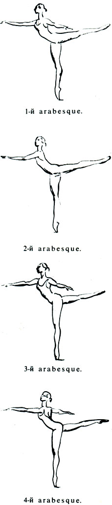 В русской школе классического танца приняты четыре вида А. I и II — ноги в положении efface. В I А. — рука, соответствующая опорной ноге, вытянута вперёд, голова направлена к ней, другая рука отведена в сторону, кисти обращены ладонями вниз. Корпус слегка наклонён, но спина вогнута (это относится и к др. видам А.). Во II А. — вперёд направлена рука, соответствующая поднятой ноге, др. отведена в сторону и иногда виднеется из-за спины. Голова повёрнута к зрителям. III и IV — ноги в положении croise. В III А. — соответствующая поднятой ноге рука устремляется вперёд, к ней направлен взгляд, другая рука отведена в сторону. В IV А. — впереди рука, противоположная поднятой ноге. Корпус развёрнут спиной к зрителю. Линия руки переходит в линию плеч и продлевается другой рукой. А. исполняется на вытянутой ноге, в plie, на полупальцах, на пуантах, в прыжке, с поворотом и вращениями. Позу можно бесконечно варьировать. Изменения в позициях ног и рук, положении спины, головы, направленности взгляда влечёт за собой преображение выразительной сути А. (напр., в балетах Ж. Коралли и Ж. Перро, М. И. Петипа и Л. И. Иванова, М. М. Фокина, Ю. Н. Григоровича).