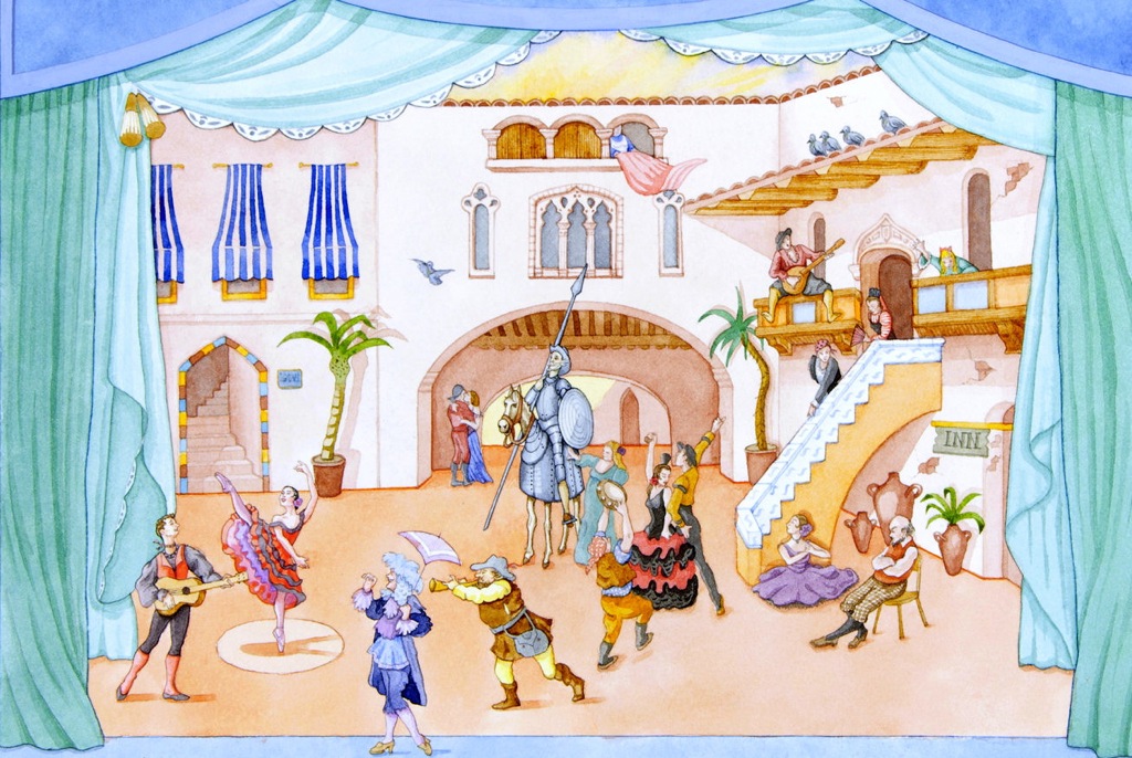Пролог. Комната Дон Кихота. Управляющий Караско и служанка, пытаясь уберечь хозяина от чтения рыцарских романов, закрывают книжный шкаф обоями. Входит Дон Кихот, читающий даже на ходу. Не найдя шкафа, он приписывает это козням злого волшебника. В его воображении возникают фантастические образы романов. Кихоту приходит в голову стать странствующим рыцарем и отправиться на поиски приключений во славу благородной Дульцинеи (так он именует Альдонизу — девушку из своей деревни). Влетает Санчо Панса. В руках — украденная курица, которой он отмахивается от преследующих его женщин. Дон Кихот берет его под свою защиту и предлагает Санчо следовать с ним в роли оруженосца. Санчо нехотя соглашается. Рыцарь достает свой шлем, но тот разлетается от первого пробного удара шпагой. Делать нечего, приходится надеть на голову тазик для бритья. Санчо не может удержаться от смеха. «Ночь наступила! Время нашего отъезда настало!», — восклицает хозяин. «Иду седлать Россинанта и своего осла», — отвечает слуга, прыгая в окно. Дон Кихот с пикой и шпагой прыгает вслед.