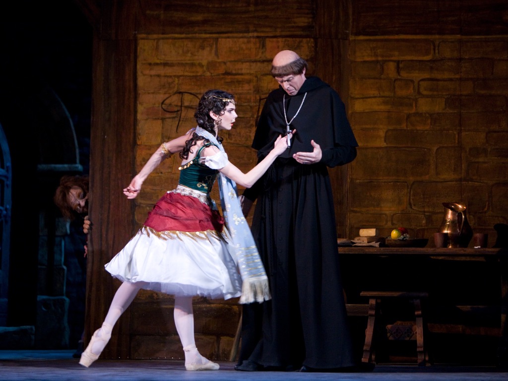 1. Двор чудес — прибежище парижских нищих и бродяг. Их главарь Клопен Трульфу восседает на бочке, наблюдая безудержное веселье своих подданных. Вбегает поэт Пьер Гренгуар и просит защиты от преследующей его толпы. Так как у бедняги в карманах нет ничего, кроме своей поэмы, которая никому из грабителей не нужна, то Клопен велит его повесить. Напрасны мольбы несчастного о пощаде, все лишь хохочут над ним. В шутку король бродяг вспоминает, что по местному закону его может спасти любая женщина, если согласится взять его в мужья. Все местные «дамы» отказываются от такой «чести», поэт в отчаянии. Под восторженные крики появляется красавица цыганка Эсмеральда. Ее сердце тронуто, и она соглашается вступить в брак с неудачником. По местным обычаям, выносят глиняный горшок, Гренгуар разбивает его об пол — брак состоялся. Танцы возобновляются, пока не звучит сигнал тушить огни. Толпа рассеивается. Соборный синдик Клод Фролло, давно влюбленный в красавицу плясунью, со своим звонарем, горбатым Квазимодо решают похитить Эсмеральду. Она отчаянно отбивается и кричит. Появляется ночной дозор во главе с блестящим офицером Фебом де Шатопер. Фролло исчезает, но солдаты ловят звонаря. Эсмеральда благодарит Феба за спасение. Тот, пораженный красотой юной девушки, дарит ей свой шарф. Увидев, что солдаты избивают Квазимодо, девушка просит освободить его. Феб великодушен, но намекает, что заслужил в награду поцелуй. Эсмеральда ускользает из его объятий и исчезает. Дозор продолжает свой путь, а Квазимодо с благодарностью смотрит вслед цыганке.