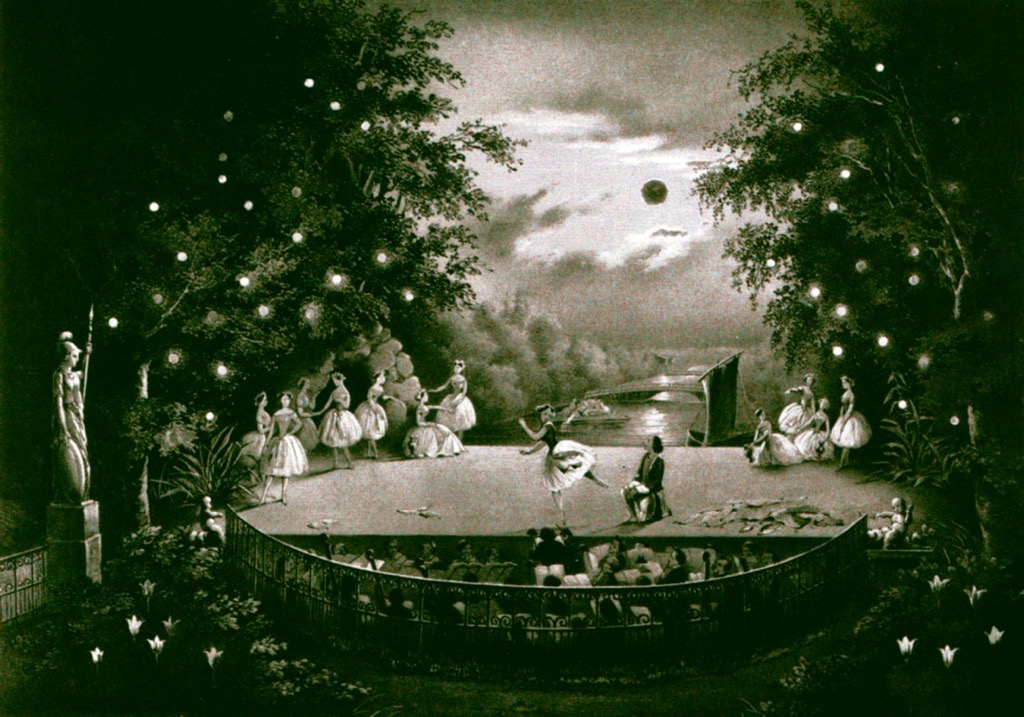 В июле того же года Перро показал свой балет в Петергофе в день именин одного из членов Императорской семьи. «На берегу залива, — писал современник, — был возведен помост, на котором происходило действие. Но в морских сценах наяды перемещались в лодки в виде раковин и плыли по морской глади, окруженные естественной декорацией — деревьями, среди которых красовались тропические растения. Погода благоприятствовала задуманному представлению, а луна освещала происходящее на сцене».
