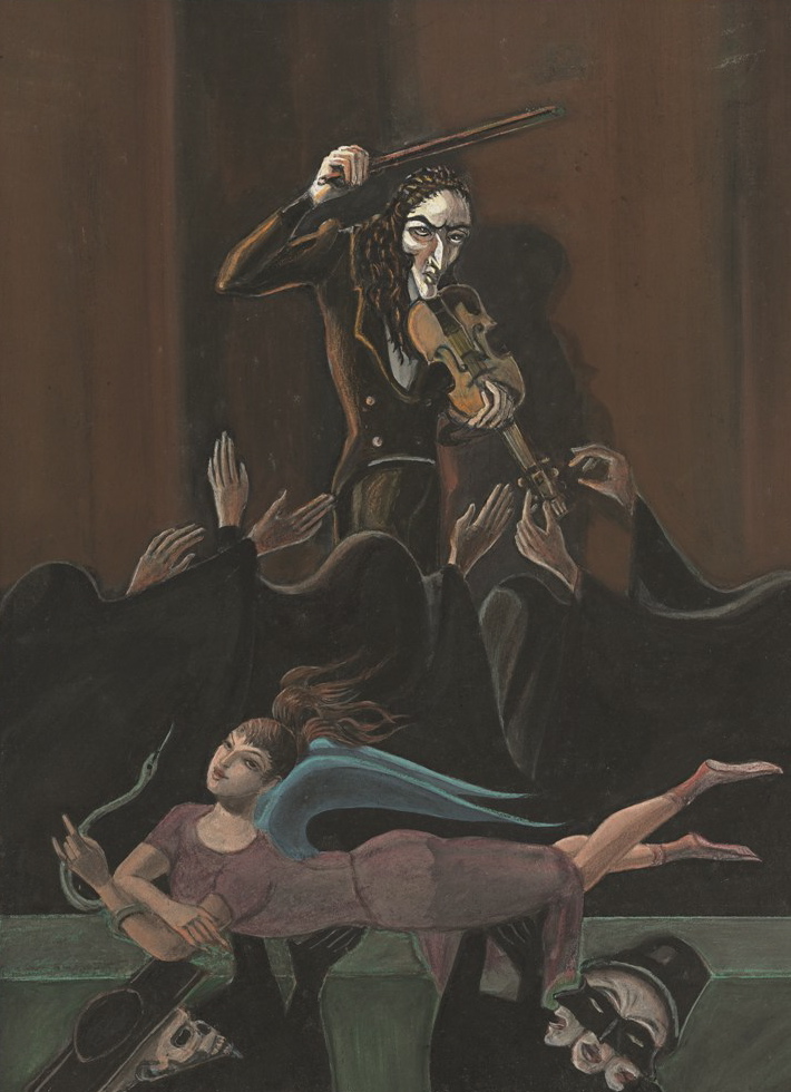 2) Враги. На заднем фоне символической фигурой выделяется Епископ. Двойники со смычками в черно-красных фраках. Черные монахи проносят на заднем плане труп. Паганини остается один.