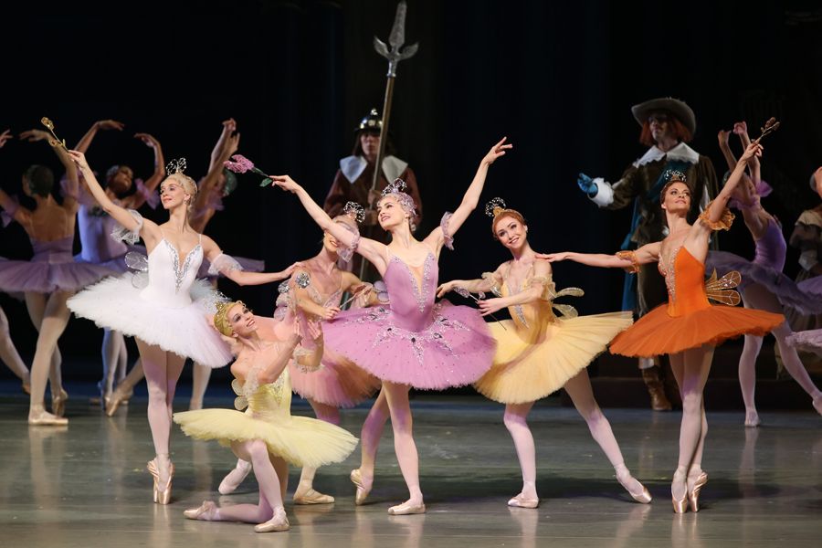 Стройный по архитектонике балет поражает великолепием разнообразных хореографических красок. При этом конструкции актов художественно продуманы. Вначале недлинный пантомимный эпизод (вязальщицы в первом акте) или жанровый танец (охота Дезире). Далее следует обширный танцевальный фрагмент (секстет фей в прологе, крестьянский вальс первого акта, придворные танцы во втором). И, наконец, танцевальный классический ансамбль (па д'аксьон) — Аврора, танцующая с четырьмя женихами, или сцена нимф. Заметим в скобках, что эту сцену соблазна Дезире ошибочно называют «танцами нереид». Такого названия не было, да и не могло быть у Петипа, ибо он знал, что нереиды «водятся» только в море, а не на берегу реки. В последнем акте изобретательный гений Петипа ослепляет зрителей причудливым узором разноплановых танцев, вершина которых — торжественное па-де-де героев.