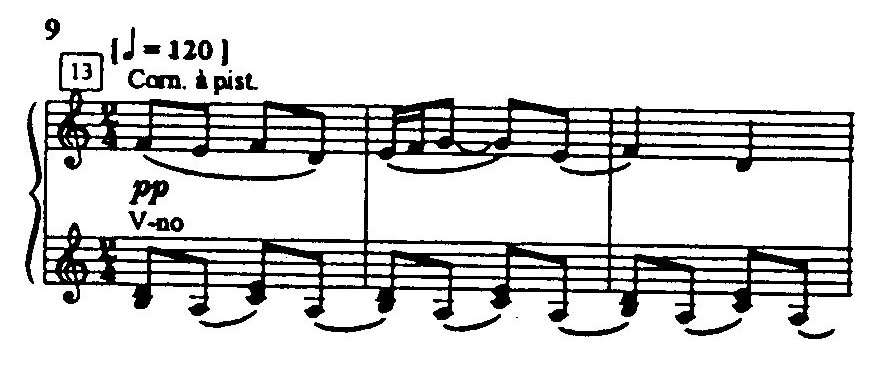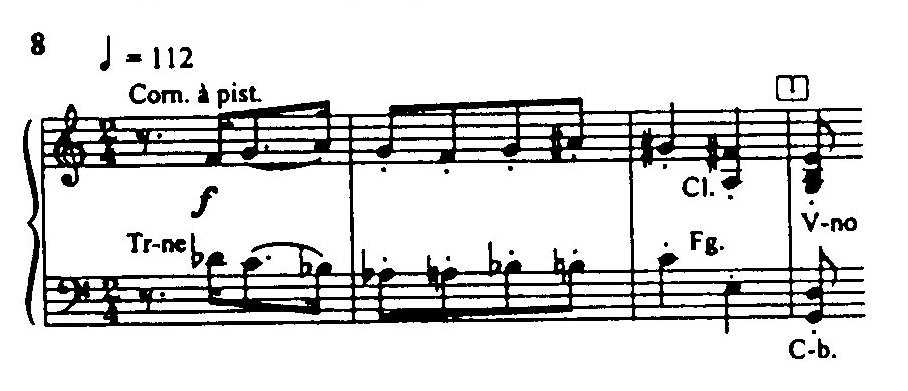 Ведущая роль в первой части «Сказки» принадлежит маршеобразному, «туповатому» мотиву, сначала излагаемому медными — корнетом и тромбоном (пример 8) и вскоре получающему остинатное сопровождение, которое почти не меняется на протяжении всего первого номера — Марша Солдата. Стравинский виртуозно передает «обрывы» мотива, его «искажения», наслоения на него фанфар (корнет, кларнет, скрипка). Поистине, этот марш наполнен горькой авторской интонацией, напоминающей о гротеске Малера.