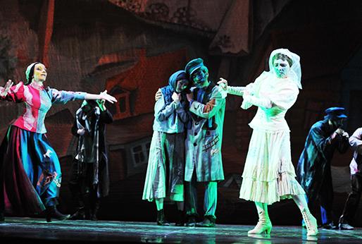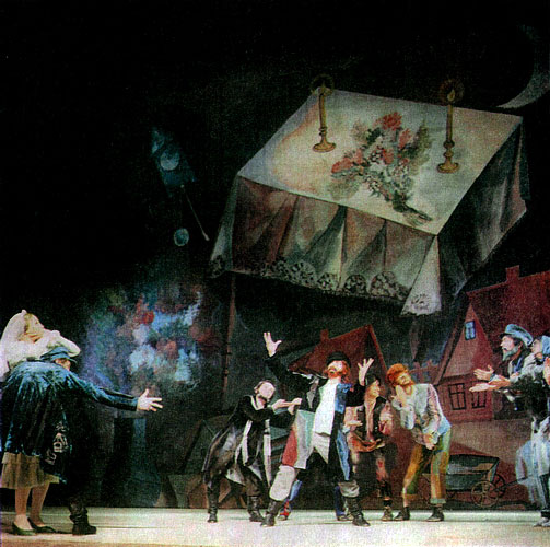 Впрочем, хореограф вдохновлялся не только музыкой Шостаковича, но и картинами Марка Шагала, творчество которого навсегда осталось тесно связанным с дореволюционным Витебском и другими центрами особой местечковой субкультуры. Художник Валерий Левенталь создал живописный задник к спектаклю, представляющий собой свободную фантазию на темы Шагала. Здесь парящий в небе накрытый стол рядом с двурогой луной, здесь на первом плане впряженная в телегу белая лошадь и нарочито искривленные домики еврейского местечка.
