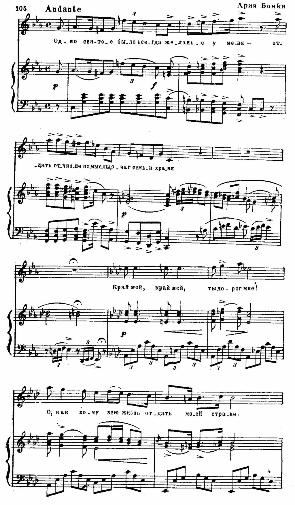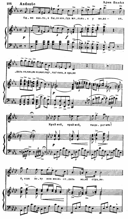 Наиболее широко раскрывается образ главного героя оперы во II акте, который начинается героической арией Банк-бана о родине. Пластичная, выразительная, ярко национально окрашенная мелодия, богатая, красочная гармония, пафос глубокого чувства скорби по разрушенному семейному очагу и страдающей отчизне, выразительно воплощенные контрасты состояний делают эту арию одним из лучших и популярнейших номеров оперы: