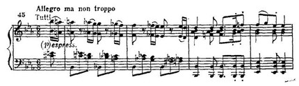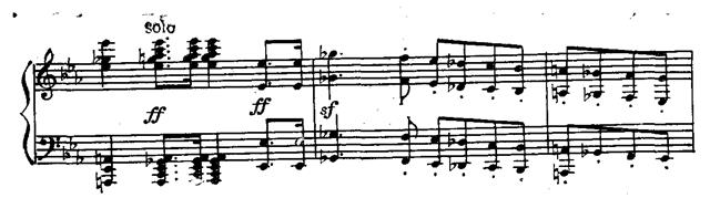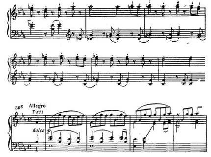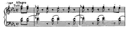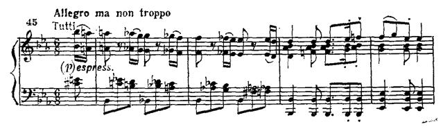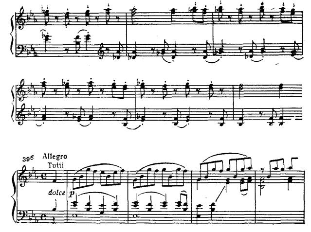Среди безудержных многооктавных пассажей и мощных аккордов лирический вариант побочной партии представляет своеобразный оазис тишины и покоя (По своей драматургической функции этот эпизод сродни аналогичной теме из первой части Четвертого концерта (см. прим. 29, 33).). Тем более драматичны перипетии развернутого заключения второй экспозиции. Завершающее ее tutti подобно заключению первой экспозиции, но приподнято на терцию выше: G-dur вместо Es-dur.