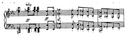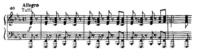 Мы уже указывали на необычное применение литавр в коде первой части Третьего концерта. Бетховен заново открыл и осмыслил выразительные возможности литавр, которые до того использовались лишь для изображения природных (например, грозы) или иных шумов (к примеру, пушечной пальбы, грохота сражений). Он придал солирующее значение литаврам не только в Третьем фортепианном концерте, но и в скрипичном концерте ор. 61, причем в очень ответственном месте — в начале произведения. Еще большую роль играют литавры в коде Пятого концерта. Очевидцы рассказывают, что на репетициях Лист тщательно добивался эффекта последовательного затухания звука. От выразительной передачи данного эпизода зависит сила воздействия стремительного динамичного подъема, завершающего Пятый концерт, музыка финала которого поражает энергией, эмоциональной порывистостью, виртуозным блеском.