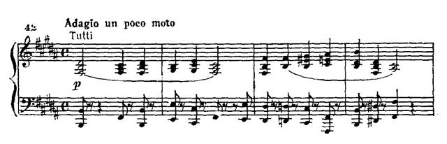 Вторая часть — Adagio un poco moto, 4/4, H-dur (Напоминаю, что во второй экспозиции первой части тема побочной партии тоже шла в си мажоре. Так устанавливаются перекрестные образные и тональные связи между частями.) — камерная, просветленная по звучанию, без труб, валторн, литавр. Начинает ее засурдиненный струнный квинтет своего рода хоралом, с мелодией редкой по обаянию, излучающей тепло: