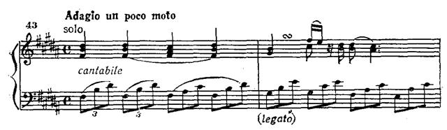 Adagio написано в трехчастной форме с чертами вариационности. Вслед за темой фортепиано излагает две монологические фразы широкого дыхания: первая (H-dur) созерцательная, во второй (D-dur), более развернутой, созерцание сменяется патетикой. Лишь после того, как волнение улеглось — оно усмирено непрерывно льющейся трелью, — возникают две вариации главной темы, динамика соотношения которых противоположна динамике монологических фраз (то есть средней, части Adagio).