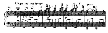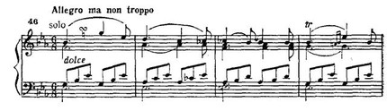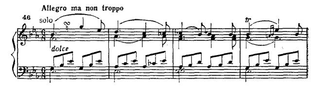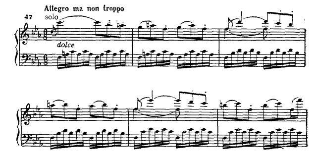 Появляются группетто, декламационные паузы (совсем «по-вагнеровски» звучит второй такт приводимого примера!), регистровые перемещения, фактура уплотняется, усиливается контраст динамических оттенков. В противовес первой, вторая вариация олицетворяет покой. В дискантовом регистре фортепиано плетет мерными шестнадцатыми нежнейший узор; поют мелодию деревянные духовые инструменты.