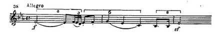 В первых трех тактах темы сосредоточены существенные для развития всей части три формообразующих элемента: а) импульс — ритмо-интонационный толчок к накоплению энергии; б) распев; в) ритмический акцент — квартовый затакт. Могучий симфонический разворот оркестровой экспозиции (в ней более 100 тактов) проистекает из этих трех элементов и дополняется двумя взаимосвязанными темами побочной партии: первая отчетливо артикулирует марш pianissimo (es-moll — Ges-dur), вторая, у валторн, — трансформирует облик марша в гимн (Es-dur; см. прим. 39б).
